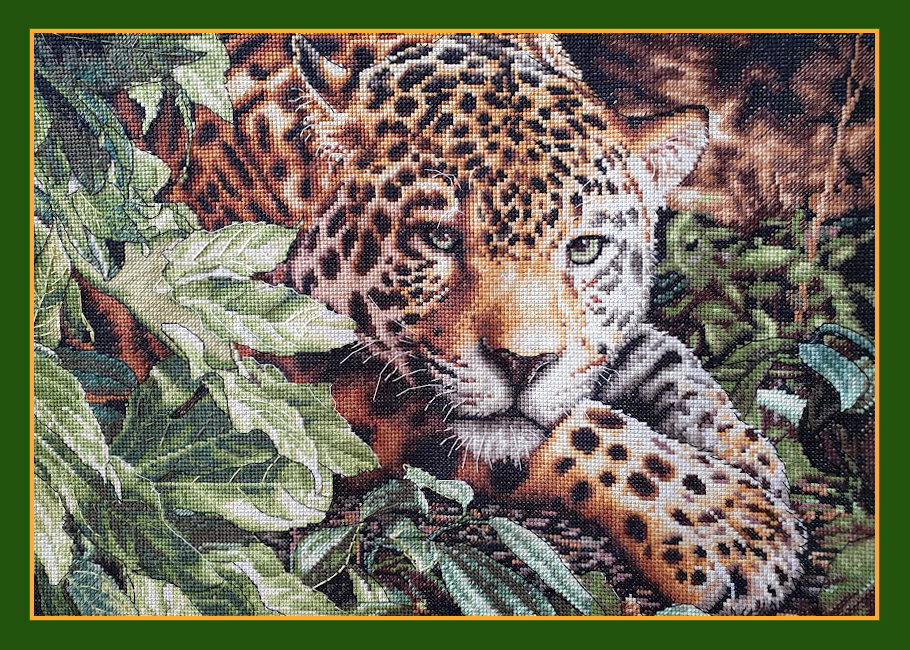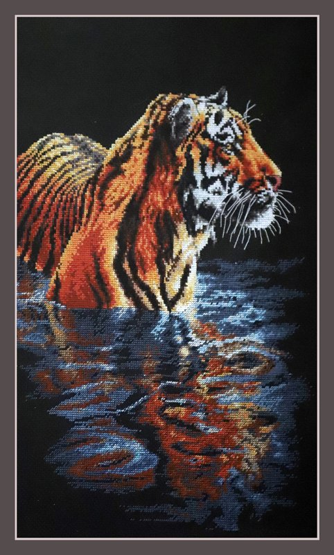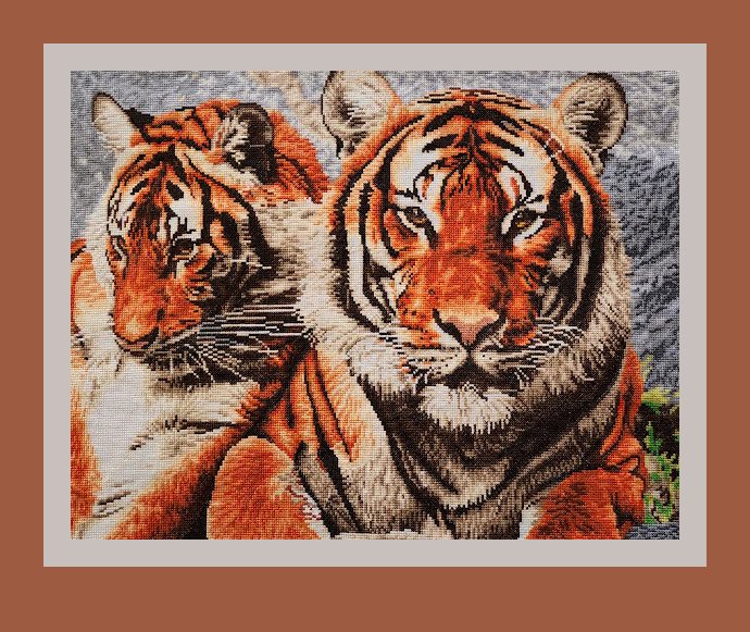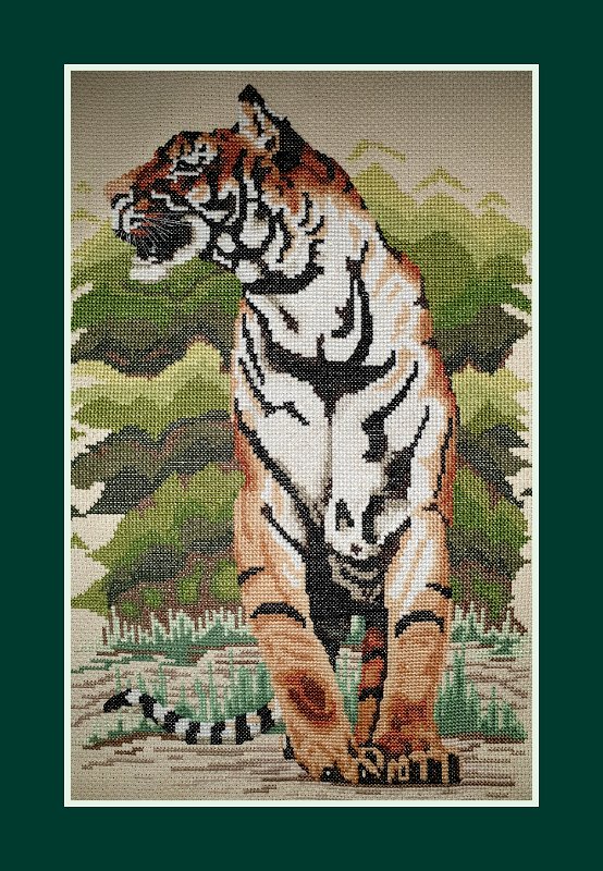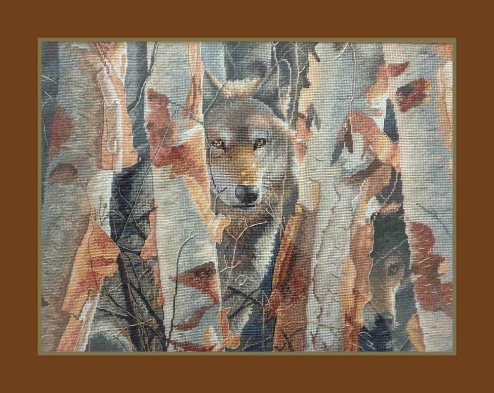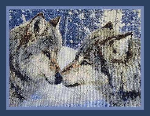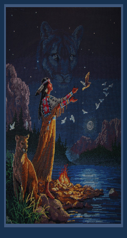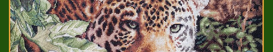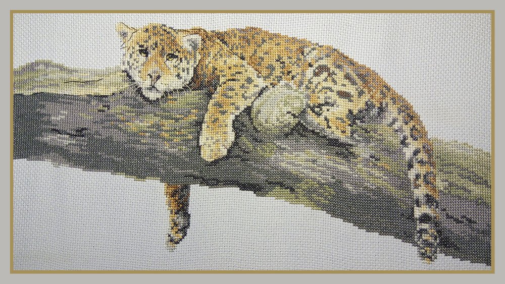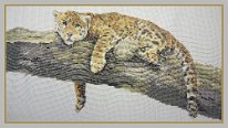 Hidden Spirits -can you see the mountain lion, buffalo, bear, indian chief with head-dress, puppy dog Wolves Grand Canal White Horses White Tiger Easy Tiger Cooling Tiger 53,460 stitches Leopard Leopard Chinese Dragon Wolves again Puppy - quite an effort - mostly backstitch. Guilty Pleasures - a combination of cross stitch and lots of back stitch. Not an easy one to count. Sleeping on the Job (latest)