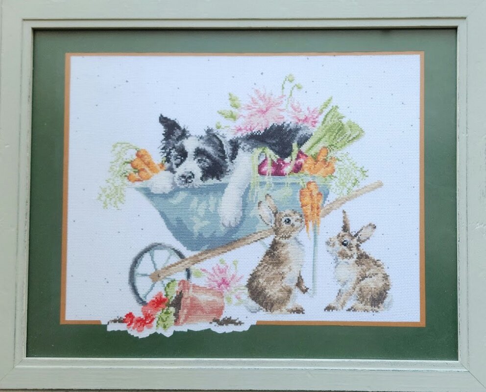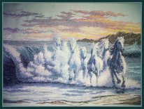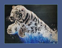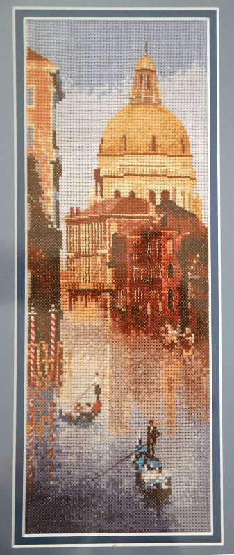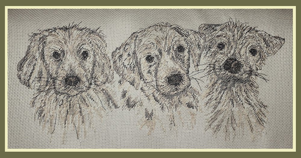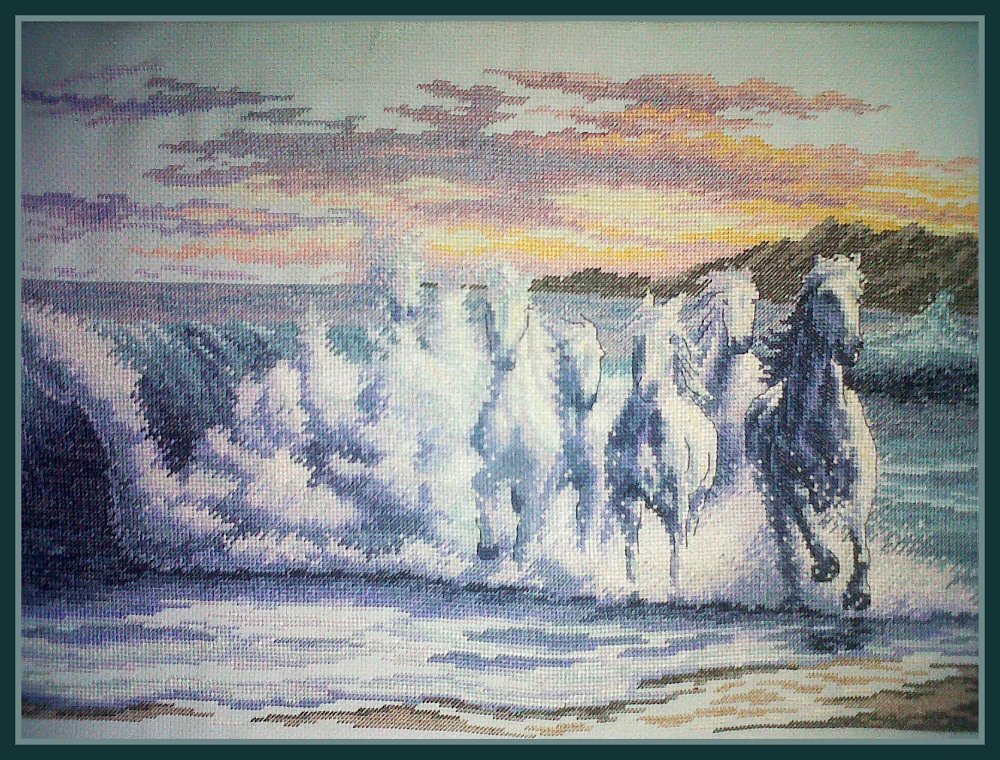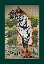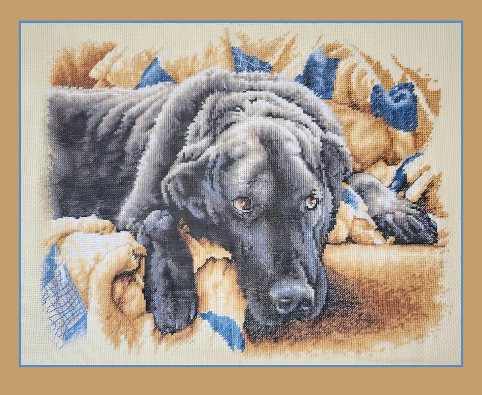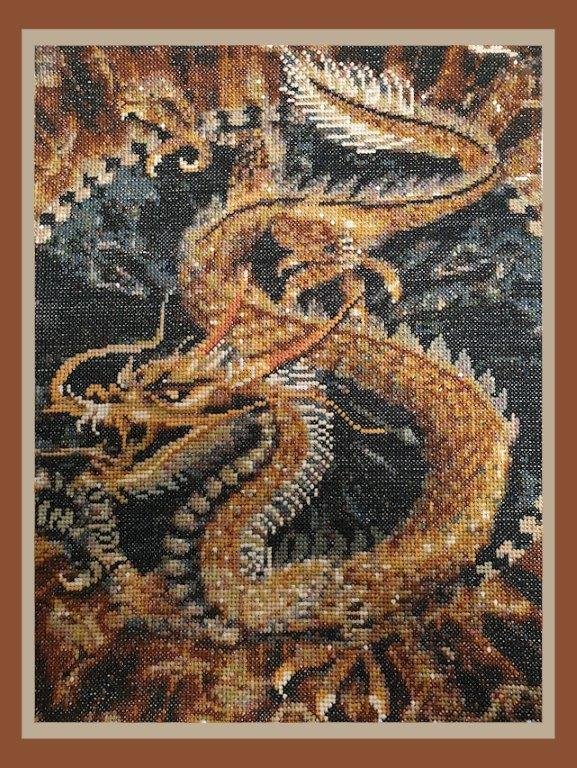 Hidden Spirits -can you see the mountain lion, buffalo, bear, indian chief with head-dress, puppy dog Wolves Grand Canal White Horses White Tiger Easy Tiger Cooling Tiger 53,460 stitches Leopard Leopard Chinese Dragon Wolves again Puppy - quite an effort - mostly backstitch. Guilty Pleasures - a combination of cross stitch and lots of back stitch. Not an easy one to count. Sleeping on the Job (latest)